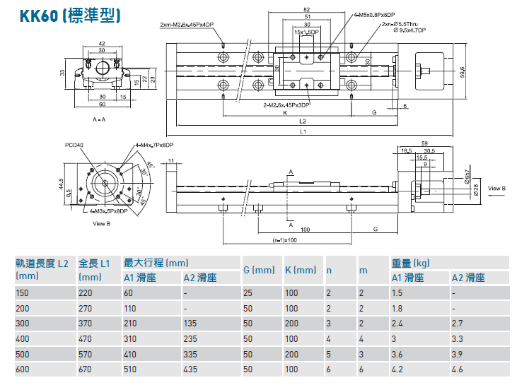 江門上銀線性模組KK6010C-150A1-F0,是普通級的,軌道長度為150,模組的導程為10,整個KK直線模組全長220,高度33,滑座的最大行程為60,模組上只有一個滑塊。