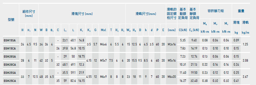上銀導軌EGH25CA滑塊尺寸參數如下: