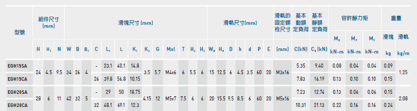 上銀導軌EGH20CA滑塊尺寸參數如下: